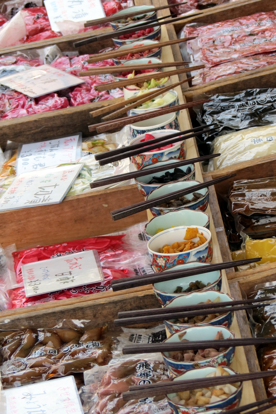 We had an early afternoon train booked back to Tokyo, so again made use of the station lockers and spent our final morning wandering the two local markets. They are not large, but promised lots of local produce. As we had not yet eaten breakfast we decided on a mission to fill our bellies with the food tasting samples on offer at the various stalls.