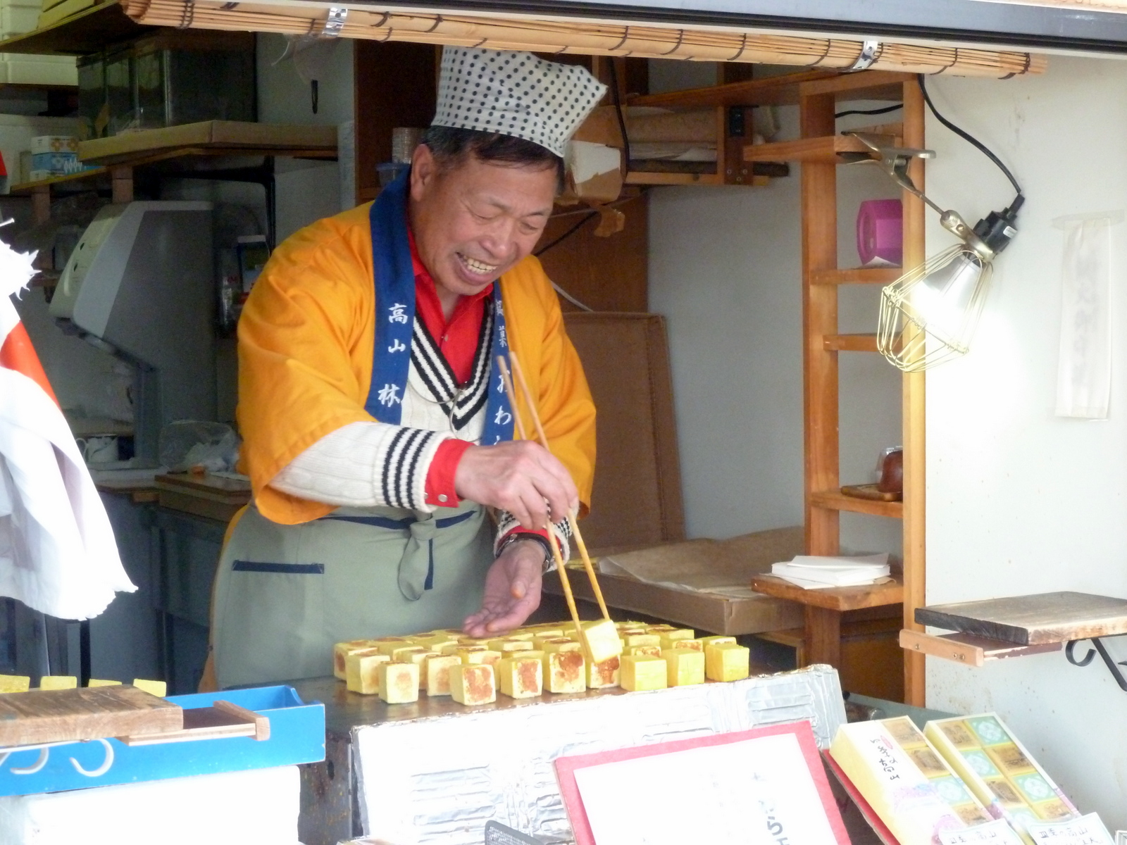 We walked across the many bridges enjoying the views and sounds of the river, as the mountain river cuts through the town. We then we wandered into the old Geisha district. The weather was better than in Shirikawa-go (no rain but still decidely chilly) so we decided a bit of saki tasting was in order to warm us up.