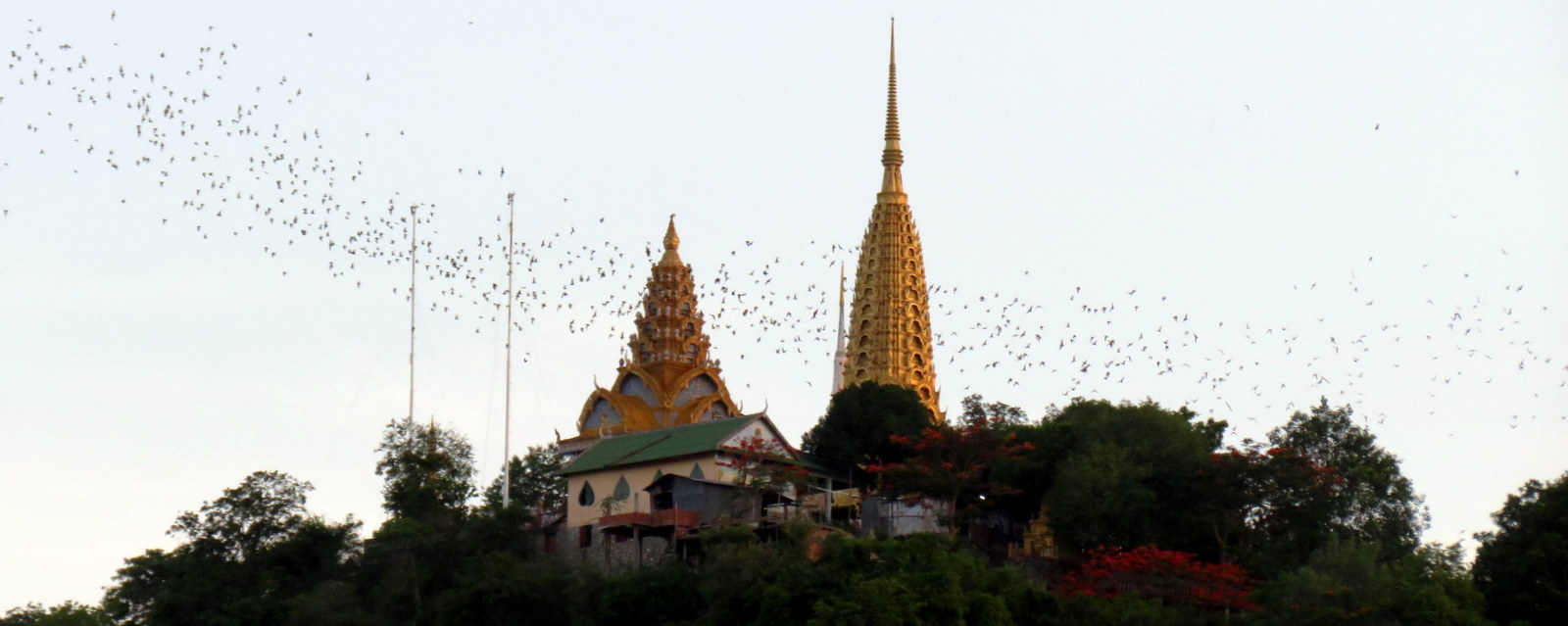 On our final evening we took a trip out to Phnom Sampeau about 12Km southwest of Battamabang .  Here you will find a series of temples perched on the top of a hill overlooking the surrounding plains and rice fields.  This is also the site of the Killing Caves of Phnom Sampeau.  These consist of three caves where, if you were  lucky, you would have been suffocated or stabbed to death by the Khmer Rouge soldiers before being pushed over the edge of the cave into the caverns below.  Many weren’t so lucky and were tossed into the caves injured, hands tied behind their backs,  but still alive and had to endure a slow and painful death of starvation amongst the corpses below.  The place is being transformed into a place of pilgrimage and there are stone tablets and wall murals adorning the walkways and temples noting the donations made by those supporting the temple building.