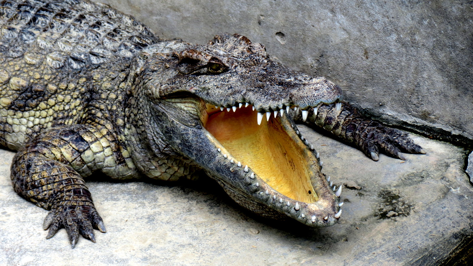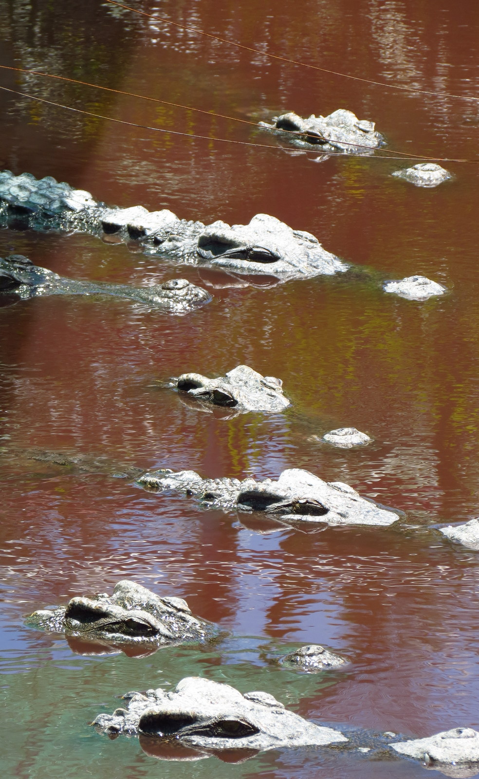 The other holding areas are filled with the mummy and daddy crocodiles who are all very very big and scary.  Mostly they sit inert either wallowing in the ponds or on the side basking in the sun with their big, scary, toothy mouths open.  Now and again this inertia is upset when one of them moves,  and when they do decide to move they move really quick, usually causing a flurry of activity with the others in the vicinity.