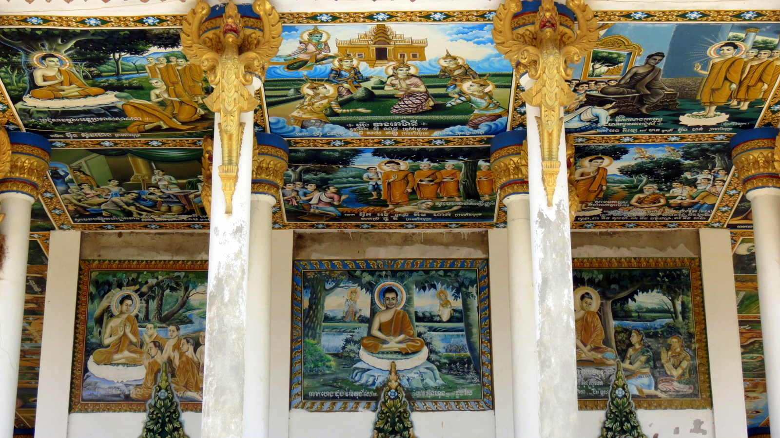 After Angkor Wat a visit to Wat Ek Phnom here in Battambang will not excite you. The site is in a perilous state and has been heavily looted over the years leaving only the skeleton of the former temple.   However, in front is a modern temple which has some pretty spectacular murals and a half finished Buddha statue.
