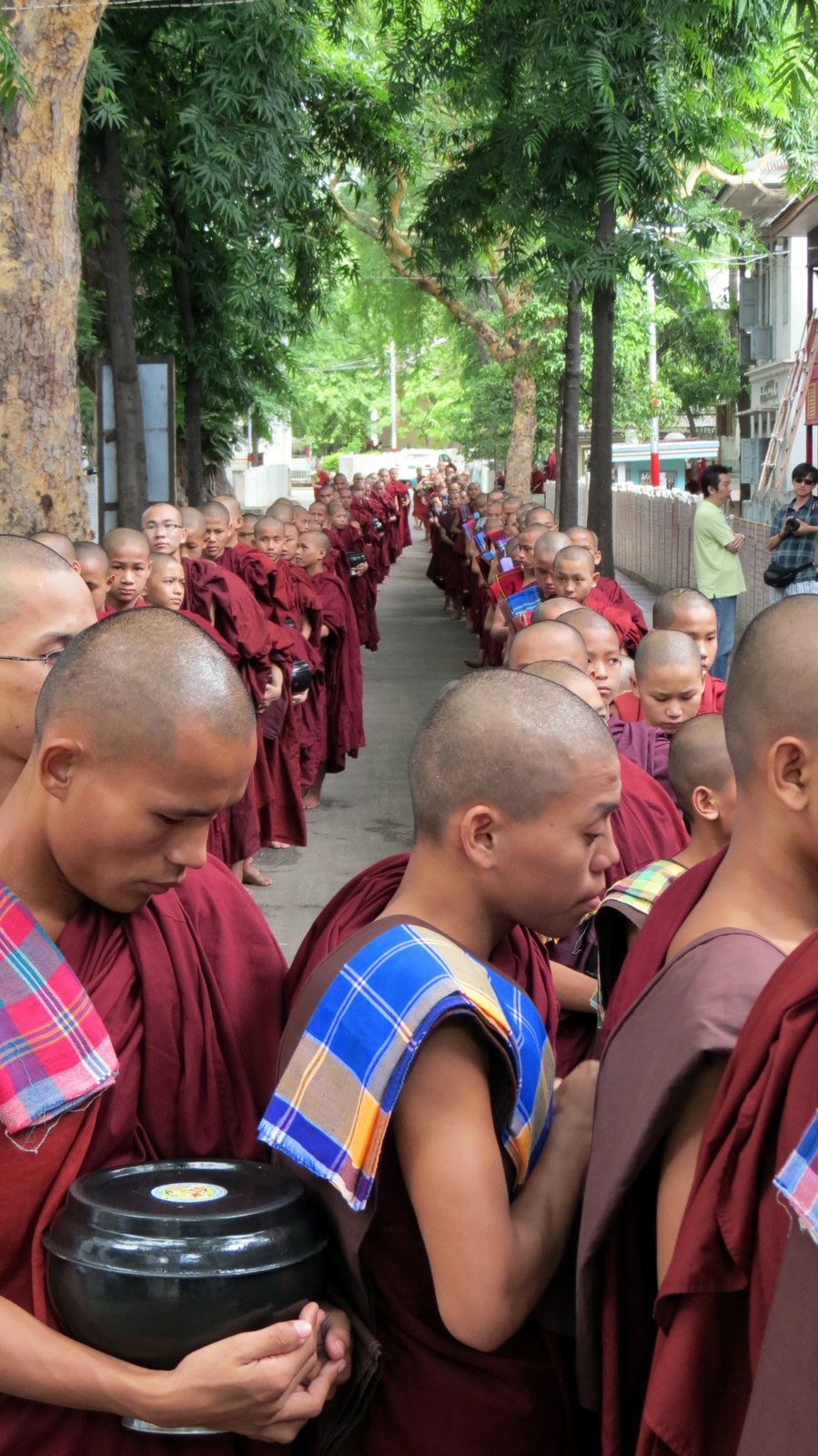 After the driver had picked up his repaired front tyre, we were on our way to our first stop of the day at Amarapura to see the monks at Maha Ganayon Kyaung.  As well as enjoying the monastery, history and buildings you get to witness the morning ritual of the monks preparing  for their lunch.  They gather in silence, in single file for their daily dining in the halls of the monastery.