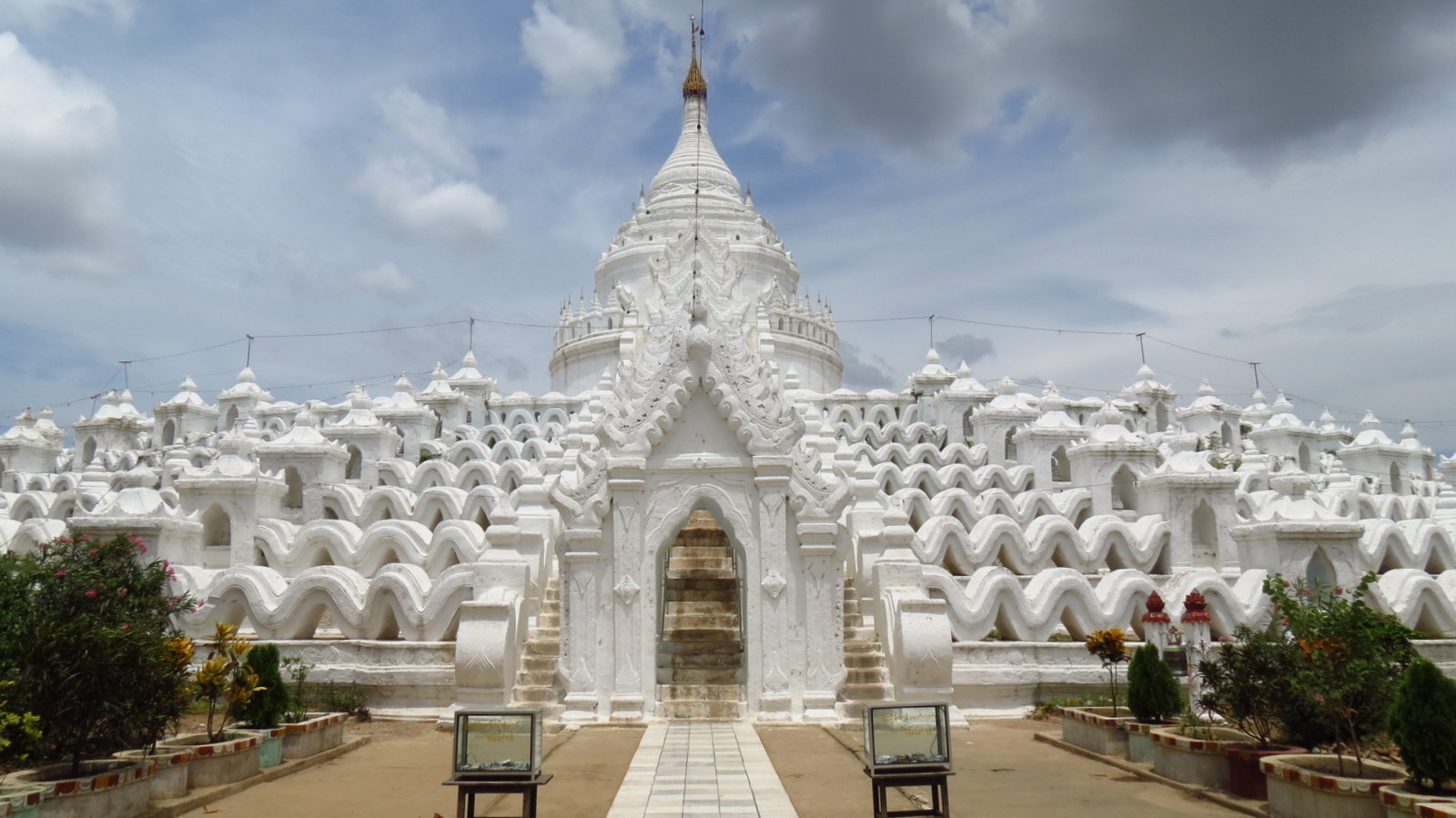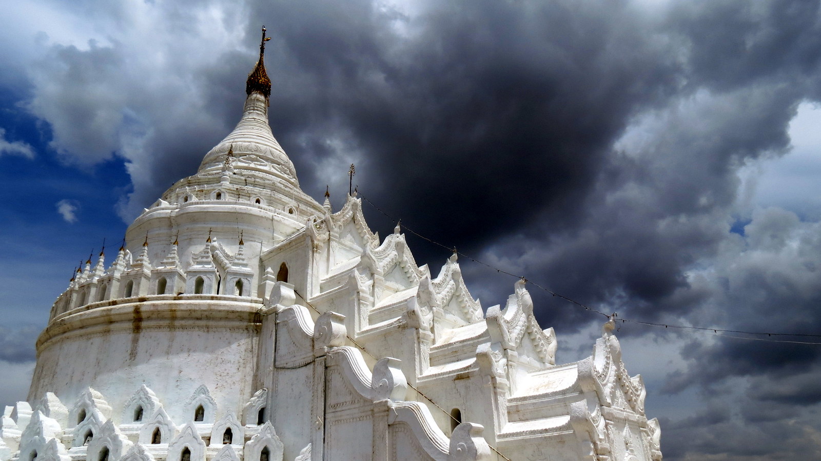 We left our final treat until last.  I had glimpsed the Hsinbyume Paya on a postcard on our tour around Inwa when I looked on the back to see where it was; so I was looking forward to this visit.  I wasn’t disappointed, the sky got moody, I got ecstatic and got my camera out to do justice to this very unusual piece of Burmese religious architecture.   The main stupa is surrounded by Gaudiesque terraced curves and makes for a wonderful sight.  They are in this form to represent the mountain ranges around Mt Meru,  the mount that is supposed to be the centre of physical, metaphysical and spiritual universes in Buddhist culture.