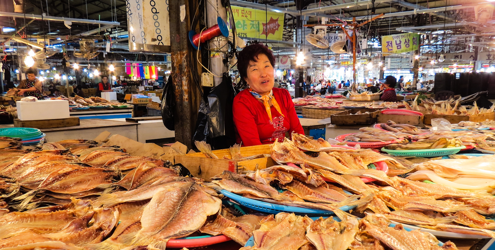 Now I am not a great lover of markets, but John is drawn to them like bees are to honey, but this is probably one of the most interesting I have visited on our trip so far. The markets are traditional and have been going on long before the tourists arrived. You can buy just about anything you need for daily life, from fish, meat (alive or dead) vegetables and clothing. There are also some interesting characters and we had some good interactions with stall holders in our own respective languages; them babbling in Korean with hand signals and us in English gesticulating in a similar fashion. They were delighted when we finally bid them farewell and both managed to say our thank you in Korean (it takes a bit mastering this thank you). We have managed to learn to pronounce it phonetically as “go-mah-sum ni da”, and it seems to do the trick. One nice tradition of these markets is that grandmothers get market pitches to sell their wares free of charge and have been able to for centuries.