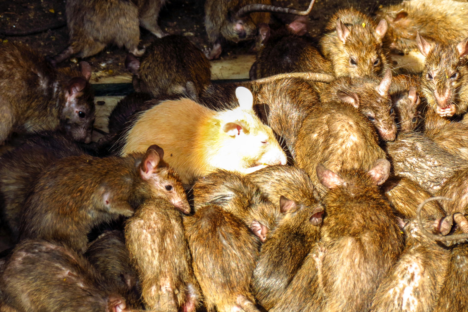 “According to legend, Karni Mata, a 14th-century incarnation of Durga, asked the god of death, Yama, to restore to life the son of a grieving storyteller. When Yama refused, Karni Mata reincarnated all dead storytellers as rats, depriving Yama of human souls.”