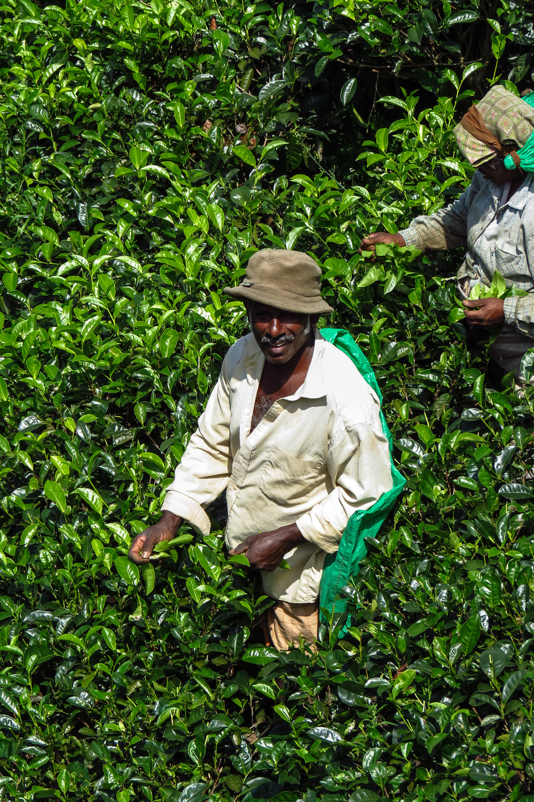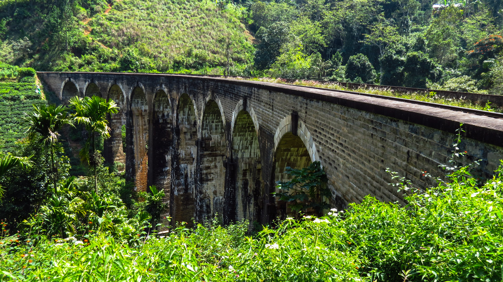 From here we cut across the hills onto some gravel and dirt tracks and inclines so steep the scooter only just made it up them. We hadn’t planned this off road experience, but on the map the roads were marked the same as the tarmac covered ones we had enjoyed for most of the day. This off road route led us to the Nine Arch Bridge which ended up being a double treat. Beware, we couldn’t have completed this off-road experience if the ground had been wet, the inclines are just too steep and the bikes wouldn’t have made it had the ground been muddy. Just by the bridge were a group of tea pickers busily at work who were all to pleased at the interruption of us and our camera.